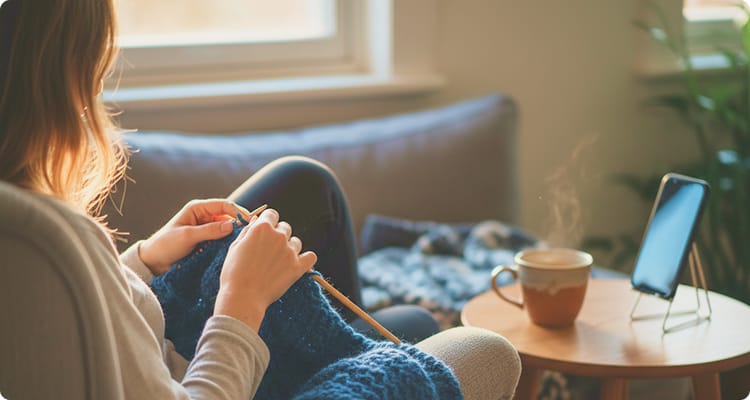 動画を見ながら、自分のペースで。スマホで手元を見ながら編めるので、初めてでも安心です。